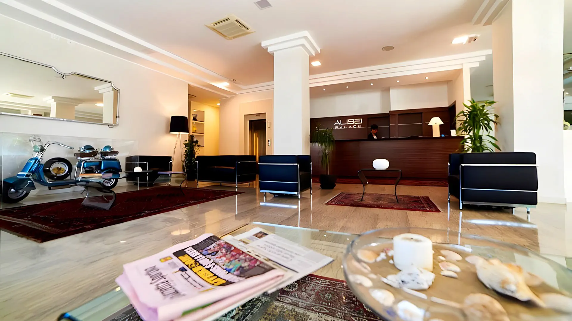 Okolica - ok. 2,5 km od centrum RIMINI - ok. 150 m od sklepów, restauracji i barów - ok. 4 km od wodnego parku rozrywki Fiabilandia i mostu Tyberiusza - ok. 25 km od San Marino - ok. 46 km od parku rozrywki Mirabilandia - ok. 58 km od Rawenny - ok. 203 km od Wenecji Komunikacja - przystanek autobusowy przy hotelu Odległość od lotniska - ok. 6 km od lotniska w RiminiPlaże - Alisei Palace