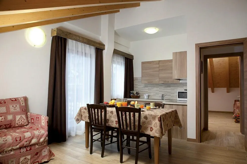 mono 2/3 - 35 m - pokój dzienny z częściowo oddzielonym aneksem kuchennym, częściowo oddzielonym łóżkiem małżeńskim i rozkładaną kanapą dla 1 osoby, mały przedpokój, łazienka zwykle z prysznicem, balkon bilo 4 - 40 m - 1 sypialnia z łóżkiem małżeńskim, pokój dzienny z aneksem kuchennym i rozkładaną kanapą dla 2 osób, mały przedpokój, łazienka zwykle z prysznicem, zwykle balkon bilo 5 - 45 m - 1 sypialnia z łóżkiem małżeńskim i 1 łóżkiem oddzielnym, pokój dzienny z aneksem kuchennym i rozkładaną kanapą dla 2 osób, mały przedpokój, łazienka zwykle z prysznicem, balkon trilo 6 - 50 m - 1 sypialnia z łóżkiem małżeńskim, 1 sypialnia z 2 łóżkami oddzielnymi lub z rozkładaną kanapą typu szuflada" dla 2 osób lub łóżkiem piętrowym (tylko w 1 apartamencie), pokój dzienny z aneksem kuchennym i rozkładaną kanapą dla 2 osób, łazienka z prysznicem lub wanną, balkon lub taras (z wyjątkiem 1 apartamentu) trilo 8 - 70 m - 2 sypialnie z łóżkiem małżeńskim i 1 łóżkiem oddzielnym, pokój dzienny z aneksem kuchennym i rozkładaną kanapą dla 2 osób, przedpokój, łazienka z prysznicem lub wanną, balkon quadrilo 8 - 73 m - 1 sypialnia z łóżkiem małżeńskim, 2 sypialnie z 2 łóżkami oddzielnymi, pokój dzienny z aneksem kuchennym i rozkładaną kanapą dla 2 osób, przedpokój, 2x łazienka, balkon Dodatkowe wyposażenie: Telewizor, suszarka do włosów, sejf, kuchenka mikrofalowa (lub w jednym pokoju 6 piekarników), Wi-FiWyżywienie - Residence Anna