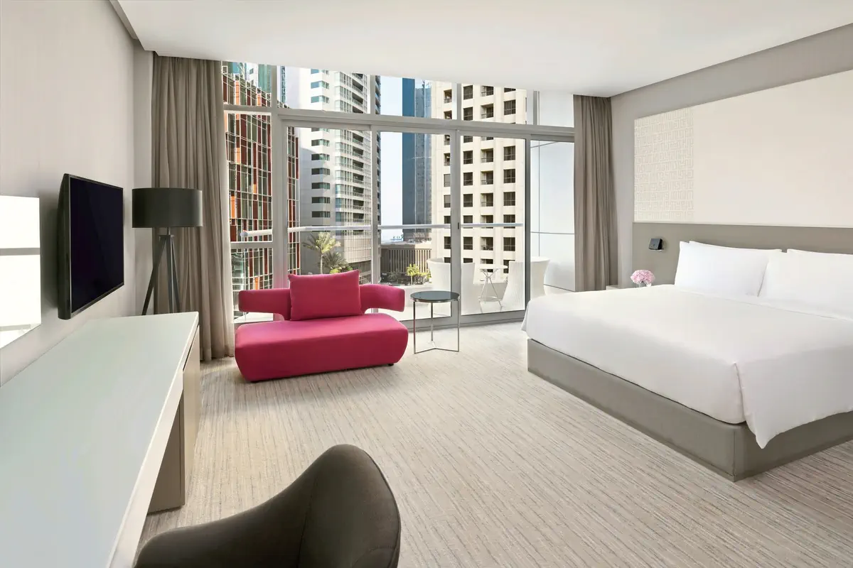 41-45 m², podwójny, piętro, niżej, łóżko podwójne (king size), wanna, kabina prysznicowa bez brodzika, WC, szlafrok kąpielowy, klimatyzacja, minibar płatne, sejf, deska do prasowania, żelazko, TV, Wi-Fi, czajnik, kawa/herbataCosy Room with Balcony & Marina View (DB2/UP2) - Intercontinental Dubai Marina