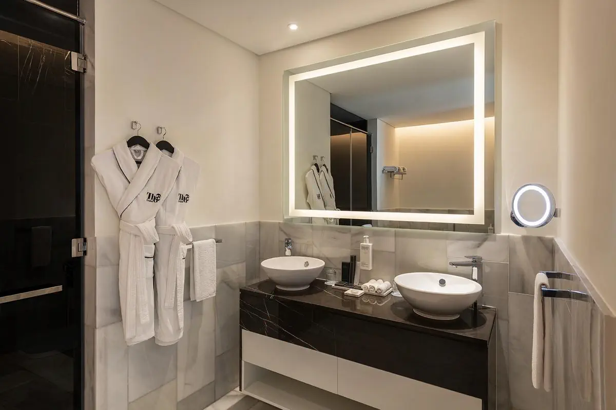 Standard Room Deluxe - sypialnia, łazienka, powierzchnia - 27 m kw., widok na ląd, części hotelowe itp. Możliwość zakwaterowania maks. 3 osób. Arabian Deluxe SeaView - sypialnia, łazienka, powierzchnia -27 m kw., widok na zatokę. Możliwość zakwaterowania maks. 3 osób. Twin SeaView Room - pokój dwuosobowy; sypialnia (dwa łóżka), łazienka, widok na zatokę. King SeaView Room - pokój dwuosobowy; sypialnia (łóżko king size), łazienka, widok na zatokę. 1 Bedroom Suite - sypialnia, pokój dzienny, aneks kuchenny, łazienka, balkon, widok na ląd. Powierzchnia - 84 m kw. 1 Bedroom SeaView Suite - sypialnia, pokój dzienny, aneks kuchenny, łazienka, balkon widok na zatokę. 2 Bedrooms SeaView Suite - dwie sypialnie, pokój dzienny, łazienka, balkon, widok na zatokę. Powierzchnia - 127 m kw. Wyposażenie: indywidualnie sterowana klimatyzacja, sejf, łącza internetowe, zestaw do przygotowania kawy/herbaty, TV sat.Wyżywienie - Th8 Palm