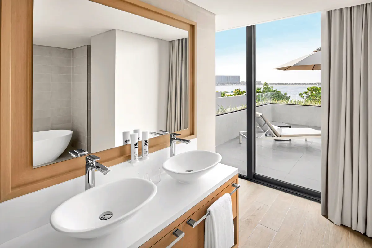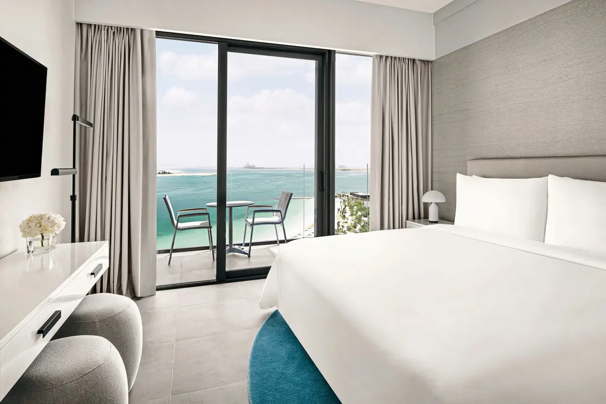 31-35 m², podwójny, widok na morze, Pościel, ręczniki i materace wykonane w 100% z bawełny organicznej, łóżko podwójne, sofa, zestaw prysznicowy, WC, szlafrok kąpielowy, kapcie kapielowe, suszarka do włosów, klimatyzacja, minibar płatne, sejf, deska do prasowania, żelazko, 1 TV, Wi-Fi, czajnik, kawa/herbata, balkon (umeblowany)Deluxe Beach and Pool View Room (DD2) - Movenpick Resort Al Marjan Island